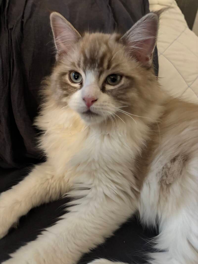 Sibyl is an absolute queen. She's this big, gorgeous Ragdoll with the fluffiest, longest fur you've ever seen and those classic piercing blue eyes. She’s got her priorities straight—sleep and food are her love languages! Every night, she insists on crawling under the blanket with me and my husband, always hunting for the best cuddle spot. She’s not super playful most of the time, but when she gets into it, she’s totally wild. And her favorite thing? Finding the tiniest box or container to wedge herself into, no matter how impossible it seems!